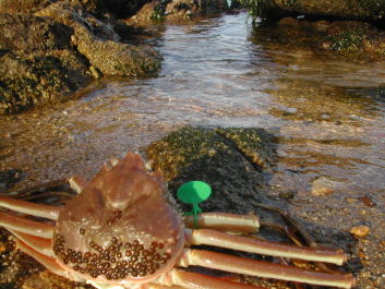 間人ガニの腕には緑色のプラスチックタグがついています。